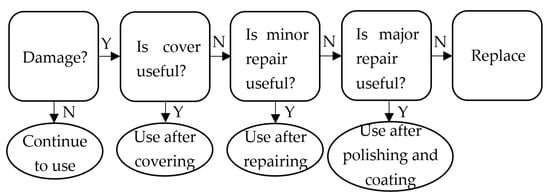 Figure 1 shows the flow chart of the optical elements in the National Ignition Facility Project (NIF) system [5]. Three processing methods are proposed for damaged elements: firstly, the damaged area is covered; secondly, if it cannot be covered, it needs to be repaired; thirdly, if it cannot be repaired, it should be replaced [6]. As an important part of the component in the NIF system, damage repair has become key to ensure the stable operation of the whole system.
