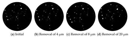 Using the laser scattering defect detector of super-smooth surface, which is made by ZC Optoelectronic Technologies, Ltd., Hefei, China, to measure the evolution of damage quantity in the process of the MR repairing, the dark field image was obtained, as shown in Figure 3. Table 2 shows the change of each size of damage points with the MR removal depth after image processing. Based on the comparison of the test results, the number of component damage points after MR repairing was significantly reduced. When the removal depth was up to 20 μm, the total number of damage points was reduced by 80%. The number of damage points with sizes larger than 20 μm were basically unchanged, but the small-scale damage points with sizes smaller than 50 μm were reduced by almost 90%. This showed that this method can effectively remove a large number of small-scale damage points.