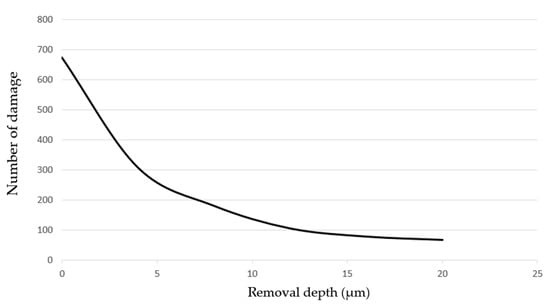 Variation of damage number where damage size was smaller than 50 μm with removal depth.