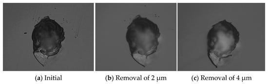 Variations in large-scale damage were also observed using the optical microscope, as shown in Figure 5. The results showed that there were clusters of small-scale damage around areas of large-scale damage before the MR repairing. When the removal depth was up to 2 μm, the number of the small-scale damage points were significantly reduced, but it was not completely repaired. When the removal depth was increased to 4 μm, the small-scale damage was basically repaired. However, it was clearly observed that the trailing phenomenon occurred at the damage point. The trailing phenomenon at the small damage points was completely removed in the MR repairing process, but the trailing phenomenon at the large damage points became serious.