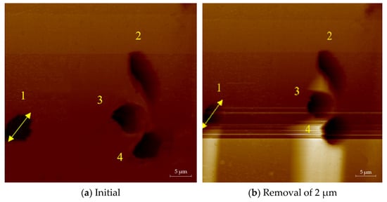 The atomic force microscope was used to randomly select small-scale damage and observe its repairing evolution process, as shown in Figure 6. Figure 6a is the initial image of the small-scale damage on the element. After removing 0.5 μm uniformly with the MR removing method, the measured results are shown in Figure 6b. The transverse size of the damage became smaller and the damage contour became more regular, as observed by comparing the two images. The profile of damage 1 measured along the MR scanning direction is shown in Figure 7. The width of the damage decreased from 7 μm ± 10% to 4.5 μm ± 10%, and the depth decreased from 620 nm to 120 nm. The depth was basically the same as the removal depth of MR, and the contour of the damage opening became smoother. The results showed that the variation of damage depth was consistent with the MR removing depth, and the repairing process did not cause damage to the bottom of the damage. This indicates that the MR removing method can effectively repair small-scale damage.
