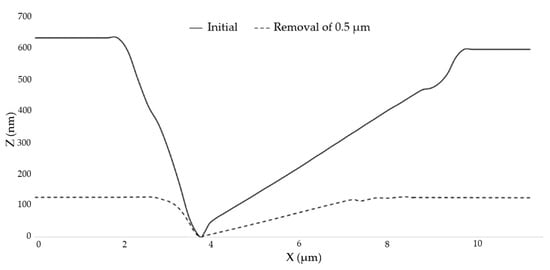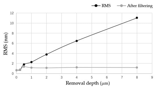 According to the division of error frequency band by Lawrence Livermore National Laboratory (LLNL), an error with F > 8.33 mm−1 was considered a high-frequency error. In order to study the variation of errors in different frequency bands by the removal depth, mid-frequency errors of F ≤ 8.33 mm−1 were filtered out in the measurement, and the variation results of surface roughness with the removal depth before and after filtering were plotted, as shown in Figure 9.
