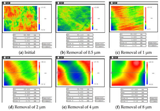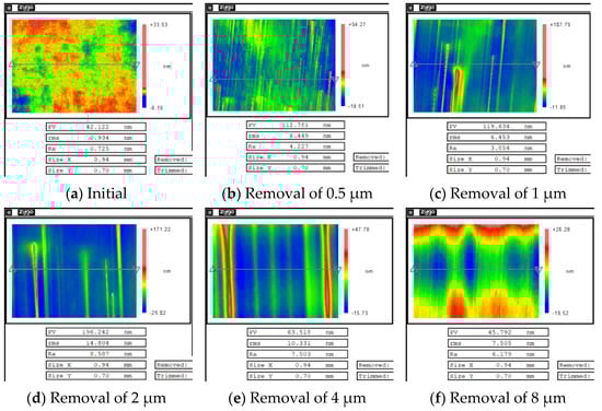 After magnetorheological treatment of the non-destructive component, the white-light interferometers with removal depths of 0.5, 1, 2, 4 and 8 μm were selected. The measurement results are shown in Figure 8. A three-dimensional white light scanning interferometer (NewView 700) made by Zygo Corporation, Connecticut, United States, was used to measure the surface roughness of optical elements. The device is a non-contact instrument for measuring the surface roughness of optical elements. Its field of view is 0.94 mm × 0.70 mm, the longitudinal resolution is 0.1 nm, the transverse resolution is 0.36–9.50 μm, and the measurement repeatability Root Mean Square (RMS) is less than 0.01 nm [22].