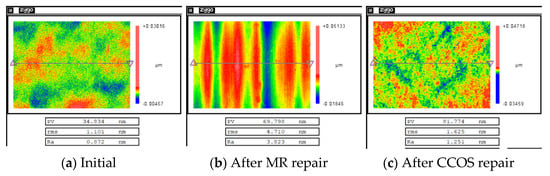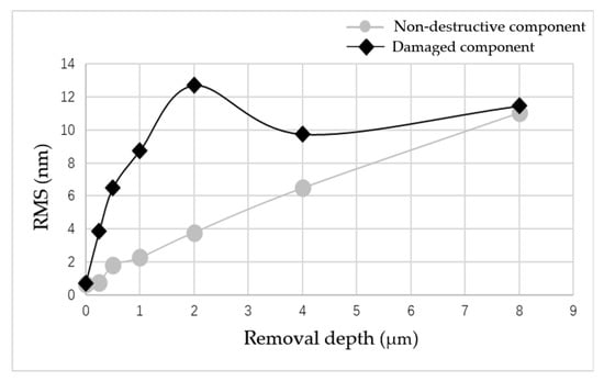 The results showed that when the repairing depth was smaller than 4 μm, the RMS increased rapidly and was is much higher than for the RMS of the non-destructive component. Then, with the increase in removal depth, RMS gradually decreased, and finally it became similar to the RMS of the non-destructive component. From the measurement results in Figure 10, it was found that during the rapid increase in RMS, many non-uniform strip tails were produced on the component surface, which gradually disappeared with the increase in the removal depth. The measurement results showed that in the process of the MR removing method, the existence of damage led to the tailing phenomenon, which was one of the reasons for the rapid deterioration of the surface quality of components. However, with the further increase in the removal depth, the influence of damage on the surface quality was gradually eliminated.