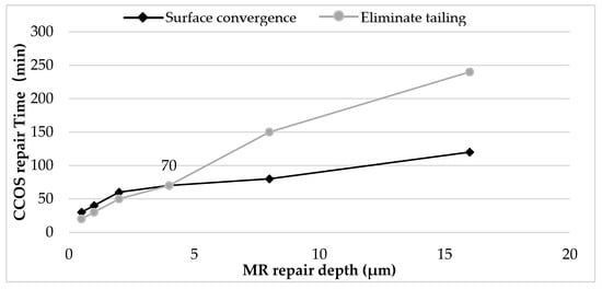 This section studies the time required for CCOS to eliminate tailing and restore surface roughness under different MR repairing depths. The results are shown in Figure 12. The black curve in the figure shows the time required for CCOS to recover the surface roughness at different MR repairing depths, and the gray line shows the time required for CCOS to eliminate tailing under different MR repairing depths. The results show that when the MR repairing depth was 4 μm, CCOS repairing needed 70 min to eliminate the tailing and restore the surface roughness. At this time, the revolution speed of CCOS was 150 rotations per minute (rpm) and the diameter of polishing powder was 1.5 μm. Other process parameters are shown in Table 3, and the corresponding depth of 70 min was 700 nm.