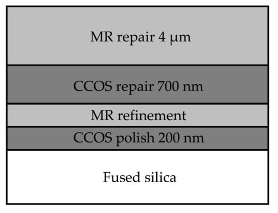Due to its excellent optical properties, fused silica is often used as a diffractive optical element and a focusing optical lens in the terminal device of high-power laser systems [1,2]. As high-powered laser optics are difficult to fabricate and easy to damage during application, it is very difficult to meet the requirements only by manufacturing methods [3]. Therefore, methods of repairing and reusing damaged components are urgently needed [4].