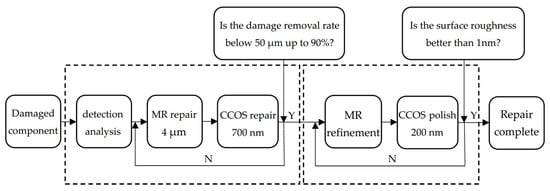 Finally, in order to further improve the surface smoothness and eliminate the sub-surface defects, the combined process parameters were optimized based on the previous process research conclusions. The final repair process is shown in Figure 13. The combination process is as follows: MR repairing of 4 μm; CCOS repairing of 700 nm with revolution speed of 150 rpm and polishing powder diameter of 1.5 μm. After two cycles to achieve the ideal repair effect, MR refinement was carried out. Finally, CCOS repairing of 200 nm with a revolution speed of 0 rpm and polishing powder diameter of 0.5 μm should be used. At this time, the damage repair effect and surface quality of components were able to meet the system index.