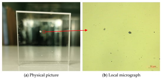 In order to verify the effectiveness of the whole repairing process, the above repairing process was used to repair the fused silica damaged components produced by an actual system. The experimental sample was a fused silica damaged component of 50 mm × 50 mm × 10 mm. Three large-scale damages were directly observed on the surface of the component. The local image in the red frame was observed through the optical microscope, as shown in Figure 15. There were also clusters of small-scale damage on the surface of the components.