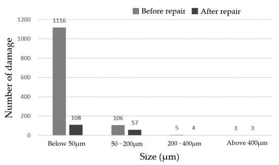 Number of different sizes of damage before and after repairing.