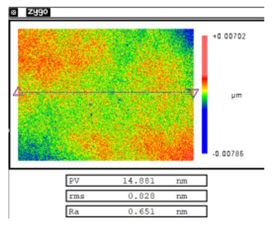 The surface roughness of the components was restored by combining MR refinement and CCOS polishing. Figure 19 shows the measurement result after the surface quality was restored. At this time, the surface roughness was 0.828 nm, which met the requirement that the surface roughness is better than 1 nm.