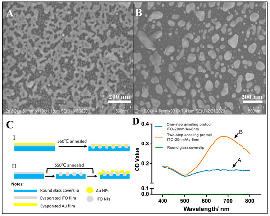 Two-step thermal annealing: First, the glass substrates were coated with different ITO thicknesses and annealed immediately at 550 °C for 3 h. Second, annealed glass substrates were exposed to different thicknesses of gold. After the evaporation, the modified Au/ITO/round glass coverslips were transferred to a high-temperature oven or onto a hot plate to conduct the thermal annealing in the presence of oxygen at 550 °C for 3 h (Figure 2B) for the second time.