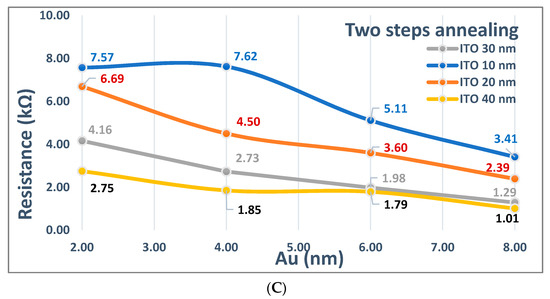 Resistance variation versus (i) ITO thicknesses before and after one-step and two-step annealing processes (A), (ii) Au thickness after one-step annealing (B) and Au thickness after two-step annealing (C) at 500 °C.