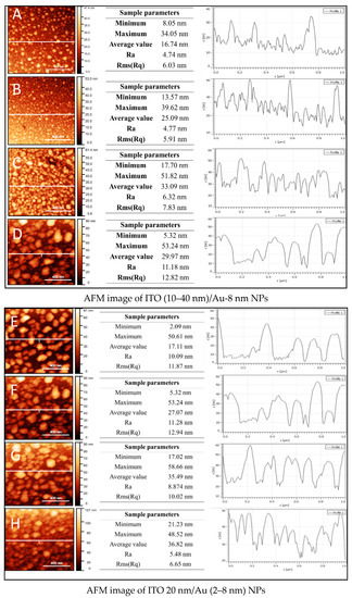 In the case of Configuration 1, the roughness values increased relative to the thickness of the ITO and can be adjusted by a quadratic function (R2 = 0.997), whereas for Configuration 2, the roughness values vary slightly for samples from 2 to 4 nm Au and decrease for samples from 6 to 8 nm Au. In fact, the decrease in the roughness values is correlated with the increase in the size of nanoparticles (Figure 6), the latter being controlled by the thickness of gold and ITO.