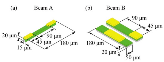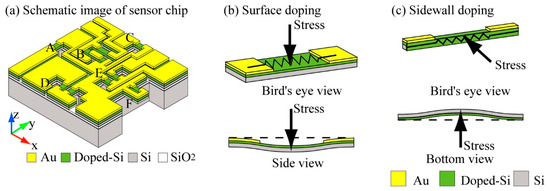 The principles to detect stresses with each type sensing elements are shown in Figure 1b,c. Figure 1b shows the principle for the surface-doped beam. Although the entire upper surface of the beam is doped, by depositing Au onto the beam surface, the resistance change of the target part can be obtained. The parts with Au deposited on them can be used as electrode pads. For the surface-doped beams, the width is larger than the thickness, so the beams are easier to bend in the direction perpendicular to the beam surface. Figure 1c shows the principle of the beam which has piezoresistors on its surface and the side wall. The sum of the resistance changes of the piezoresistors formed on both surface and side wall can be measured by using the Au wiring partly formed on the surface of the beam. As same as the case of the surface doped beam, the resistance change of the aimed point of the piezoresistor can be detected by changing the design of the Au wiring.