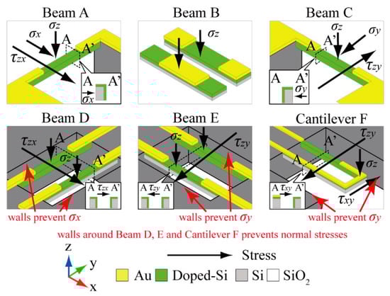 There are six groups of sensing elements on this sensor chip. Among the six groups of sensing elements, Beam A and C consist of one beam. Beam B, D, and E consist of a pair of beams. Cantilever F is a U-shaped cantilever type structure. A schematic of each sensing structure is shown in Figure 2. The 3-axis normal stresses and the 3-axis symmetrical pairs of shear stresses can be detected by embedding this structure inside the cubic silicone rubber. When stress is applied to an elastic body such as silicone rubber, the elastic body usually deforms uniformly, so the microstructure placed inside moves along the deformation, and distortion which deforms the elements, as shown in Figure 1b,c, does not occur. However, when a structure with much higher rigidity than silicone rubber is arranged inside it, the difference between the deformation between the elastic body and the rigid structure will occur a distortion at the surrounding of the rigid structure. The stresses applied to silicone rubber will be able to measure by arranging the sensing elements (such as Figure 1b,c) around the edge of the sensor chip and by measuring this distortion. Additionally, we placed silicon walls around some of the sensing elements to prevent the propagation of some of the stresses and enabled to measure the target directional component of the stress with that element. The details of relationship between the sensing elements and the stress measurement are shown in the following.