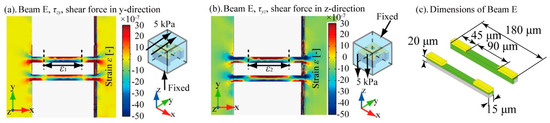 FEM simulation of shear stresses τzy and τyz. (a) strain distribution around Beam E caused by τzy, (b) strain distribution around Beam E caused by τyz, and (c) sensor dimensions to detect shear stresses.