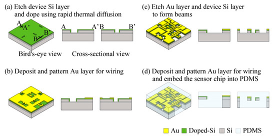 To form piezoresistive layers in multiple directions, we used surface and sidewall doping methods similar to those in our past studies [16,17]. Figure 7 shows bird’s eye and cross-sectional views of the fabrication process of our sensor chip.