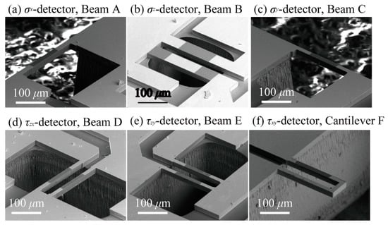 SEM images of the fabricated sensing elements inside the sensor chip. (a) SEM image of fabricated Beam A, (b) SEM image of fabricated Beam B, (c) SEM image of fabricated Beam C, (d) SEM image of fabricated Beam D, (e) SEM image of fabricated Beam E, (f) SEM image of fabricated Cantilever F.