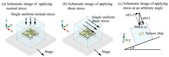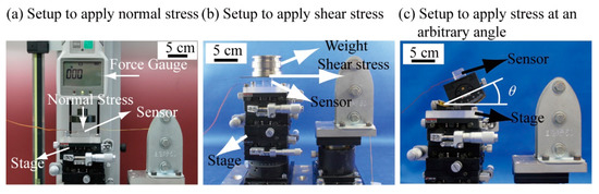To apply normal and shear stresses to the fabricated sensor, we used the following three types of experimental setups shown in Figure 10 and Figure 11.
