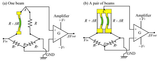 For the structures consisting of one piezoresistive beam, the circuit shown in Figure 12a was used to measure the resistance change of the beam. The differential voltage ΔVout can be found as