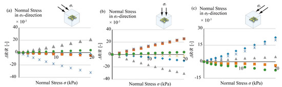 Figure 13 shows the relationships between normal stresses applied in the x, y, and z directions and the resistance change rates of the 6 beams. The sensitivity of the x-axis normal stress detector (Beam A) was ΔRx/Rx = 1.06 × 10−3 σx (Figure 13a). This relationship was obtained by using least-squares regression of the sensor outputs. The coefficient of determination R2 was 0.9995. This output could be compensated for by the values of the stress–strain matrix after the experiment. Similarly, when y and z axis normal stresses were applied to the sensor, the outputs of the sensor were as shown in Figure 13b,c. The sensitivities of the y axis detector (Beam C) and z axis detector (Beam B) were ΔRy/Ry = 1.08 × 10−3 σy and ΔRz/Rz = 1.27 × 10−3 σz. The coefficients of determination were 0.9993 and 0.9995 in each experiment.