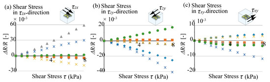 Sensor outputs under shear stresses; (a) responses to τzx, (b) responses to τzy, and (c) responses to τxy.