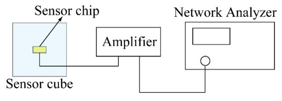 To detect a small change in the resistance, the output was amplified 1000 times by an amplifier circuit. In this paper, we targeted to measure almost static change of the stress tensor for building fatigue evaluation. To measure this static stress tensor without high frequency noise, we used low pass filter for the output signal of each beam group. In the actual experiment, the high frequency electrical noise, which comes from the outer electronics and the power source, will be overlaid to the sensor output. Our low pass filter was designed to cutoff these noises and to increase S/N ratio of the sensor output. To evaluate the characteristics of this filter, we measured the noise level and compared it with the level of the static sensor output signal by the method introduced in previous research [20,21,22]. A sketch of the experimental setup is shown in Figure 15. In this experiment, +1 V DC power was supplied to the sensor cube as in the calibration experiment. However, there was no stress applied on the sensor chip at the time of detecting the noise level. The amplified output of the sensor cube was imported into the noise level analysis machine net analyzer to conduct the analysis.