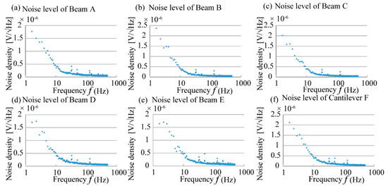 Because the high frequency noise has been cut off by the low pass filter connected to the amplifier, the analysis will focus on the low frequency noise level. In this research, the noise level detected for each beam group from 1 Hz to 500 Hz is shown in Figure 16. The noise level analysis is based on a range of frequencies. For this experiment, we arbitrarily selected frequency ranges of 1–10 Hz and 1–100 Hz to analyze the noise level for each beam. The noise level for each beam in the two frequency ranges is shown in Table 4. From the experimental results, the noise levels in the frequency ranges of 1–10 Hz and 1–100 Hz are almost the same, of an order of 3 μV. If the output signal of the sensor chip is smaller than the noise level, then the effect of noise cannot be ignored, as shown in Figure 17.