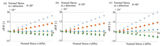 Sensor outputs under normal stresses; (a) responses to τzx, (b) responses to τzy, and (c) responses to τxy.