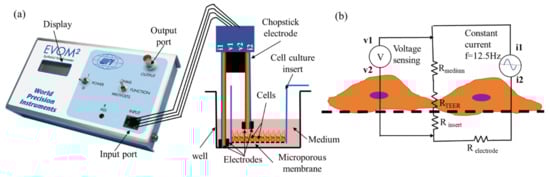 One such popular volt-ohmmeter is the EVOM® (World Precision Instruments (WPI), Sarasota, FL, USA)-. It is widely utilized for measuring TEER in transwell samples [8]. It comes with a chopstick type electrode with four electrode terminals that are inserted manually across a transwell insert (Figure 1a). By passing a constant AC current through the outer electrodes and measuring the voltage drop across the inner electrodes, the ohmic resistance of the tissue barrier sample is calculated (Figure 1b). The resistance value is recorded, usually at an interval of 24 h, and the TEER value is calculated by subtracting the resistance of the tissue barrier from the initial background value (freshly seeded insert samples). Hatherell et al. used EVOM® to evaluate barrier integrity of blood brain barrier [22] and Chen et al. used it to investigate ARPE barrier integrity as part of the investigation on choroidal angiogenesis [18].