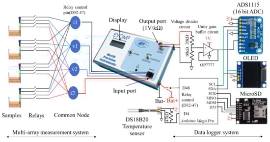 System schematic showing the multi-array measurement and custom data logger system of the proposed EVOM add-on device for real-time TEER measurement in multiple tissue culture transwell samples. Detail schematic is available in Supplementary File S1.
