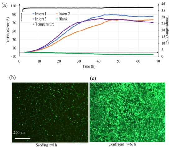 TEER measured using EVOM® systems is typically reported at an interval of 12–24 h. Since TEER values change continuously as the cells proliferate, much information is lost when the observation time interval is long. Here, as shown in Figure 4a, our system can report the TEER change at a much shorter interval of 15 min. In this proof-of-concept experiment with three cell containing samples (labeled as insert 1–3), it can be seen that as the cells proliferate, a gradual change in TEER occurs. However, this change is not same for all samples because the cell proliferation can differ in the transwell inserts. Nonetheless, as the cells become confluent, the TEER tend to plateau. The maximum average value here was (81 ± 7) ohms·cm2 (at t = 50 h, n = 3 samples) which is close to the previously reported TEER value of 90 ± 15 ohms·cm2 [18]. Figure 4b shows the fluorescence image of the ARPE-19 cells after 1 h of seeding, and Figure 4c shows cells when they were confluent (t = 67 h). For the non-cellular sample (labeled as blank), the resistance value remained constant with slight deviation (5 Ohms·cm2). This deviation is because we used a low-cost pseudo-Ag/AgCl electrode that comes with the EVOM® system. The stability of the electrode can be improved further by using better quality reference electrodes.