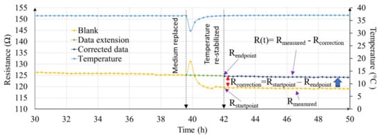 Graphical illustration showing influence in resistance after medium change process and procedure used to correct the data offset. Only “blank” data (t = 30 h to t = 50 h) is plotted for clarity.