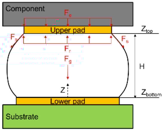 where and , respectively, represent the upper and lower boundary conditions of the solder ball (Figure 1). By applying a slight upward or downward interference on the pad, the restoring force of the solder ball in the direction of gravity can be determined. When the restoring force of the solder ball equals the gravity exerted on the solder ball, the molten solder ball achieves static equilibrium. Then, the height and geometry of the solder ball under static equilibrium can be determined.