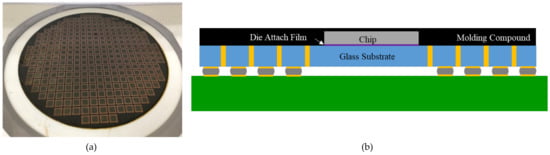 (a) Fan-out wafer-level package (FO-WLP) after debonding; (b) schematic of the fabricated FO-WLP onboard.
