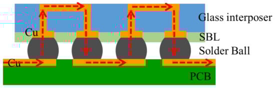 Glass is an insulating material, and hence its electrical characteristics are more favorable than those of silicon. In addition, the thickness of a glass substrate can be modified without additional thinning and polishing processes, and through glass via (TGV) technology does not require an additional barrier layer, greatly reducing the production cost. Moreover, the coefficient of thermal expansion (CTE) of glass can be optimized to reduce warpage [,] and improve the reliability life of stacked fan-out wafer-level packaging (FO-WLP). Hence, a fan-out structure with a glass substrate is favorable for high-frequency applications [,]. However, before mass production, packaging must pass reliability life testing under thermal cycling loading; in the JEDEC(Joint Electron Device Engineering Council) standard (JESD22-A104D), the thermal range is −40 to 125 °C. Finite element analysis is widely used to optimize package structures [,,,,,]. In this study, we proposed an FO-WLP with a glass substrate architecture and used it as a PoP. We fabricated FO-WLP test samples, subjected them to onboard thermal cycling testing (OBTCT), and verified the results against those of the finite element models described below. In the fabricated FO-WLP structure, the corner solder joint is the critical failure point because during heating and cooling, stress and strain accumulate in these joints due to mismatches in the CTE of the package and the printed circuit board (PCB), eventually leading to failure.