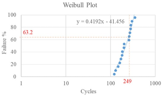 For reliability testing, we subjected 16 test vehicles to onboard thermal cycling. The test conditions follow the JEDEC standard (condition G): temperature range, −40 to 125 °C; ramp rate, 16.5 °C/min; dwell time, 10 min. The Weibull distribution of the test results (Figure 4) revealed that the mean time to failure was 249 cycles when the cumulative failure percentage equaled 63.2%. Moreover, all 16 samples failed at the top of the outermost solder joint.