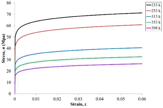 The test vehicle was composed of an Si chip, a die attach film, a glass substrate, a stress buffer layer (SBL), copper, SAC305 solder balls, a PCB, and a molding compound. We used three types of glass substrates whose CTE ranged from 3.17 to 9.8 ppm/°C and whose modulus ranged from 64 to 74 GPa, with little difference in Poisson’s ratio. The material parameters are listed in Table 2. The temperature-dependent characteristics of all of the materials were linear, except for the SAC305 solder balls. Figure 5 shows the stress–strain curve of the solder balls at different temperatures [].