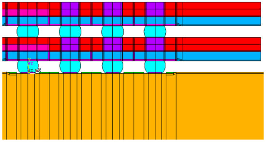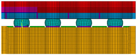 For the finite element analysis of the 2D model, we assumed plane strain and used PLANE42 and PLANE182 (ANSYS, 2020R2). Surface Evolver was used to define the shape of the solder joints. Figure 6 depicts the top view of the test vehicle, where the solder joints located in the periphery array format are marked in white. The finite element model was a 2D half model built along the diagonal of the test vehicle (Figure 7). Its position is the yellow line in Figure 6. Figure 8 illustrates the finite element model of the stacked FO-WLP (PoP) structure. The upper and lower stacks of the package were connected through soldering and TMV. The TMV was 0.25 mm in diameter and located atop the solder balls.