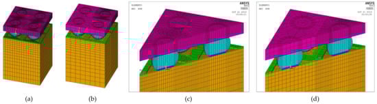 Three-dimensional (3D) finite element model: (a) Full fine-mesh model; (b) multipoint constraint (MPC) model; (c) cross-section view of the full fine-mesh model; (d) cross-section view of the MPC model.