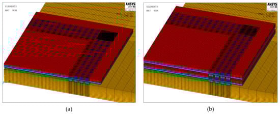 Three-dimensional MPC-reduced finite element models for the (a) FO-WLP and (b) FO-WLP PoP.