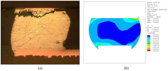 We repeated the above simulation for the FO-WLP PoP structure. Again, we found that strain concentrated in the bottom layer of the solder ball with the maximum DNP, replicating the trend of failure at a corner location. Moreover, the maximum strain was in the upper pad (Figure 17). The upper and lower parts of the solder balls in the bottom layer were connected to the glass substrate and the PCB, respectively. Therefore, these solder balls could withstand greater stress than could solder balls in the upper layer. However, this double-layer structure reduced the cycling life to 974 cycles. In the PoP structure, the percentage of glass in this package increased; therefore, the equivalent inelastic strain due to CTE mismatch also increased, and a higher strain may lead to earlier failure.