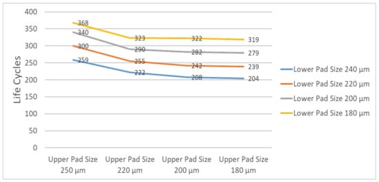 Next, we conducted a parametric study to optimize the reliability life under different combinations of upper and lower pad diameters. As evident in Figure 12, an upper pad larger than a lower pad resulted in better reliability. The Young’s modulus of silicon material is stronger than that of PCB, so a larger upper pad size is required to reduce the equivalent inelastic strain. A lower strain can have better reliability life, and the strain of the solder ball is related to the pad size, contact angle, and standoff height of the solder ball. In the simulation, when the upper pad diameter was 250 µm and the lower pad diameter was 180 µm, the best reliability life cycles could be achieved. That is, the pad on the interposer side should be larger than that on the PCB side. The optimal reliability life of 368 cycles was achieved at an upper pad/lower pad diameters ratio of approximately 1:0.72.