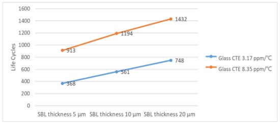 In addition to the already optimized pad combination, three design parameters were considered in our parametric study: SBL thickness, chip thickness, and CTE of the glass substrate. In this parametric analysis, SBL thicknesses of 20, 25, and 30 μm, chip thicknesses of 90, 100, and 150 μm, and glass substrate CTEs of 8.35 and 9.8 ppm/°C were evaluated, yielding 16 combinations (Table 4). SBLs thicker than 30 μm were not evaluated due to the manufacturing difficulty. The results showed that the thicker the SBL, the higher the reliability and the higher the released stress/strain concentration. Furthermore, a lower chip thickness yielded a higher molding compound volume, which in turn increased the CTE of the whole package and thus narrowed the CTE mismatch between the package and PCB. Most importantly, glass CTE was found to have the strongest decreasing effect on the CTE mismatch between the glass substrate and the PCB. In summary, the reliability life of FO-WLP PoP can be increased by optimizing the SBL thickness and glass CTE (Figure 18). Of the 16 simulated combinations, combination 13—SBL thickness, 30 µm; chip thickness, 90 µm; glass substrate CTE, 9.8 ppm/°C—yielded the longest life cycle of 1427 cycles (Table 4).