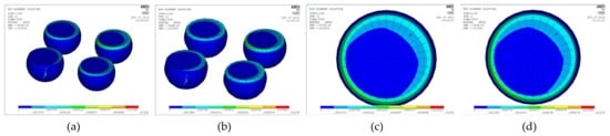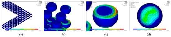 Unlike a 3D finite element model, a 2D plane strain model cannot accurately represent semi-spherical-type features. However, a 3D model with a fine mesh contains a large number of elements and necessitates excessive simulation computing time, making parametric study infeasible. Two approaches can be used to overcome these drawbacks. The first is to build a 3D model to verify the 2D plane strain model, which can then be used to evaluate the packaging structure, and the second is to reduce the number of elements in the 3D model. In this work, we used multipoint constraint (MPC) technology to significantly reduce the number of elements. Panels (a) and (c) in Figure 9 illustrate 1/4 models of a simple WLP with full fine meshes, and panels (b) and (d) illustrate their MPC-reduced counterparts. This simple 1/4 WLP model will not take too much simulation time and was selected in this research to verify that the MPC model can obtain stress/strain results similar to the full fine mesh model.