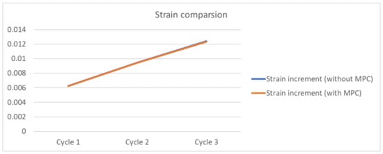 The 3D FO-WLP PoP simulation model is much larger than the nonstacked FO-WLP, which makes 2D simulation the only feasible option for the parametric study of a stacked FO-WLP. To verify whether a 2D model can be applied to stacked packaging, a 3D model must first be established. To reduce the computing time, the number of elements and nodes must be decreased. First, we established a small WLP model (four solder balls per quarter model; Figure 9) both as a full fine-mesh model (86,656 elements; Figure 9a) and an MPC model (32,648 elements; Figure 9b). The corresponding computing times were 5 h 43 min and 2 h 13 min. We applied the same thermal loading as in the earlier analyses (−40 to 125 °C). Strain was found to be concentrated in a corner of the ball and the upper edge (Figure 14). After one to three thermal cycles, the strain increment in the two models differed by less than 1% (Figure 15). These simulation results demonstrate the feasibility of applying the MPC approach to simulate FO-WLP PoP with 112 solder balls per quarter model, as shown in Figure 10.