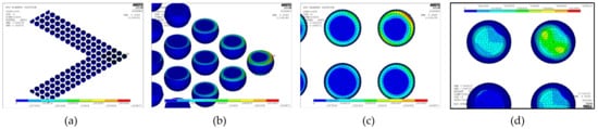 Equivalent inelastic strain distribution of the FO-WLP: (a) All solder joints; (b) location of the maximum strain; (c) top view of the bottom solder joint with the maximum distance from the neutral point (DNP); (d) bottom view of the solder joint with the maximum DNP.