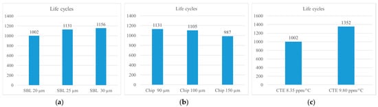 Life predictions of the FO-WLP PoP under different (a) SBL thicknesses, (b) chip thicknesses, and (c) CTEs.