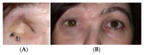 (A) ITAPs embedded into the skull for a prosthetic eye, (B) Prosthetic eye mounted on the ITAPs into the skull [11].