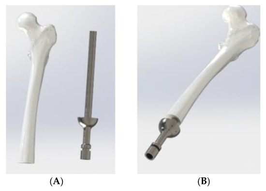 (A) Quarter Amputated Femur with accompanying ITAP CAD models, (B) Femur and ITAP assembly [17].